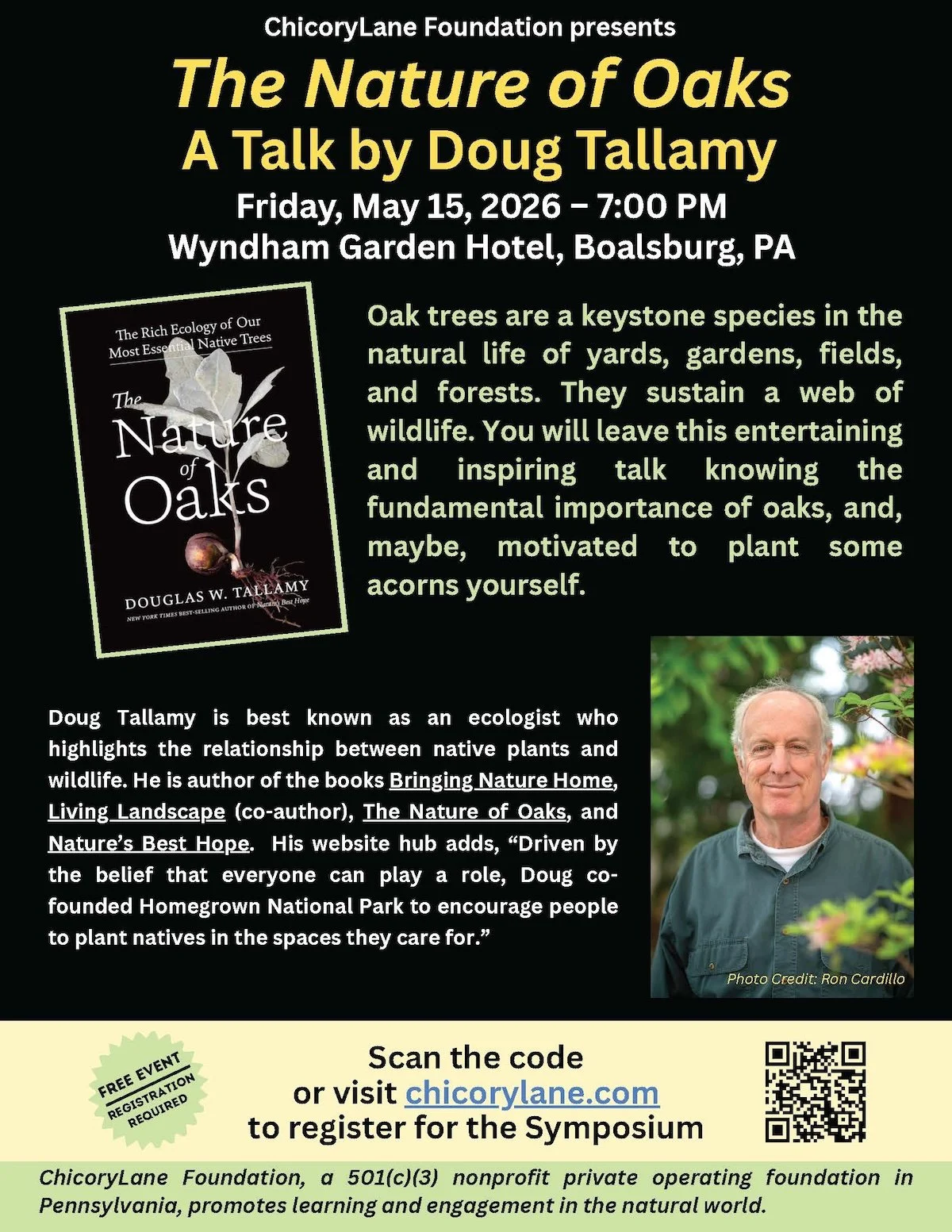 Keynote by Doug Tallamy, Ecologist, T. A. Baker Professor of Agriculture in the Department of Entomology and Wildlife Ecology at the University of Delaware, where he has authored 115 research publications and has taught insect related courses for 45 years. Chief among his research goals is to better understand the many ways insects interact with plants and how such interactions determine the diversity of animal communities. His books include Bringing Nature Home, The Living Landscape, co-authored with Rick Darke, Nature's Best Hope, a New York Times Best Seller, The Nature of Oaks, winner of the American Horticultural Society’s 2022 book award, and his latest book How Can I Help.