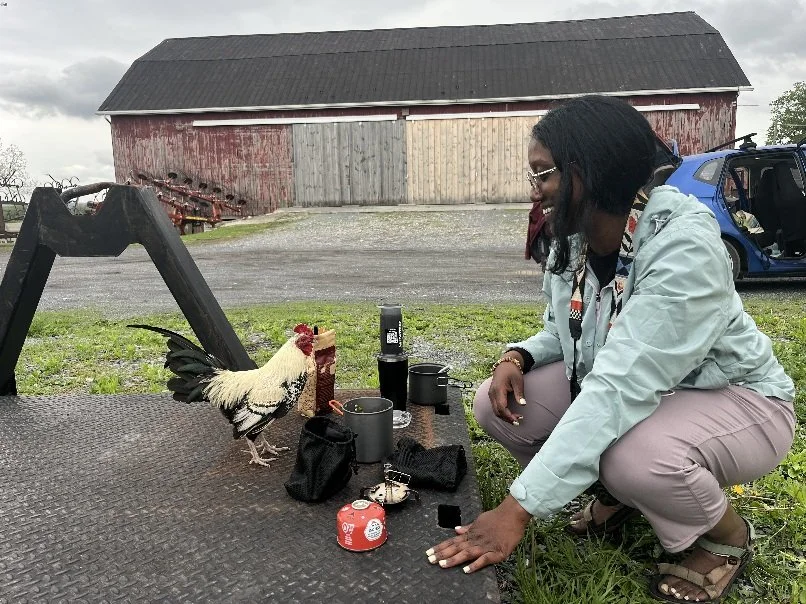 Around 1:00 PM, we took our leave of the lake and drove back to Rhoneymeade, saying farewell to Autumn who headed back to Shaver’s Creek to assist with the set-up for the closing ceremony of the competition. Jas, Jen and I sprawled on a trailer bed near the barn, eating soup and snacks in the company of one very friendly and curious rooster. As a birder, I’ve deeply enjoyed training my ears to be constantly filtering the surrounding environment both passively and actively for the songs of feathered creatures, and as we ate, my senses suddenly tuned into a jumbled song in the tree near us. I turned to Jen and Jas and tentatively said “I think I’m hearing a Bobolink…” We focused our attention, walking towards and around the tree until the black and white bird with a beige patch on its head came into view, and I soaked in its presence, as it was one of the birds I was most hopeful to see and hear. Found in specific grassland habitats, but not overly abundant in Central PA, I love seeing these birds.
